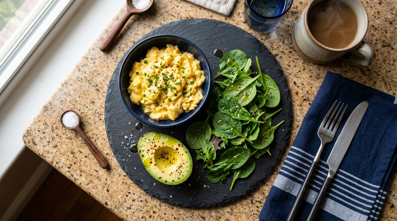 Breakdown: ~45g fat, ~25g protein, ~10g net carbs. Creamy, satisfying, keeps you full until lunch.