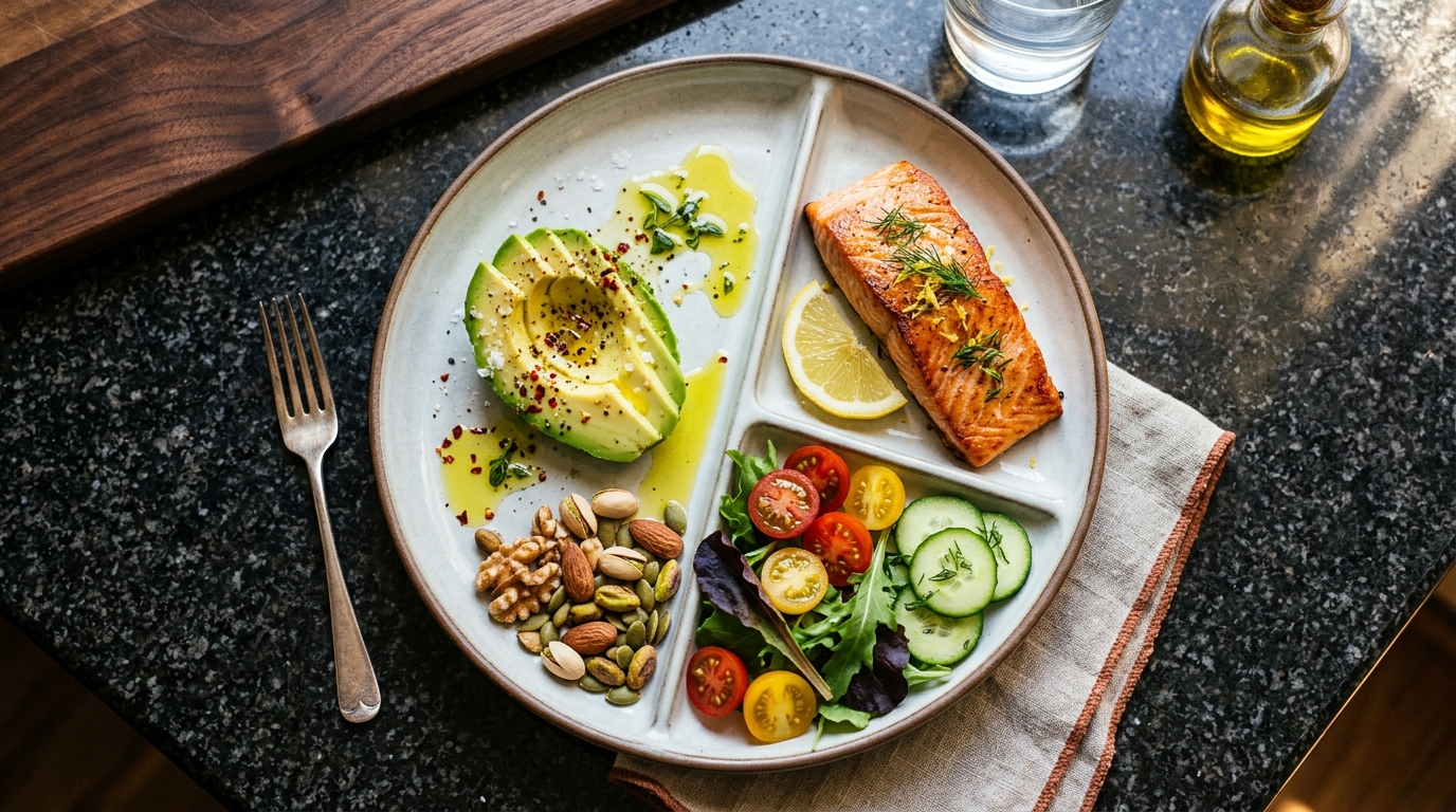 Per meal, target 20-30g of fat: - Avocado (half): 12g - Olive oil (1 tbsp): 10g - Nuts (small handful): 12g - Cheese (1 oz): 9g - Salmon (3 oz): 9g